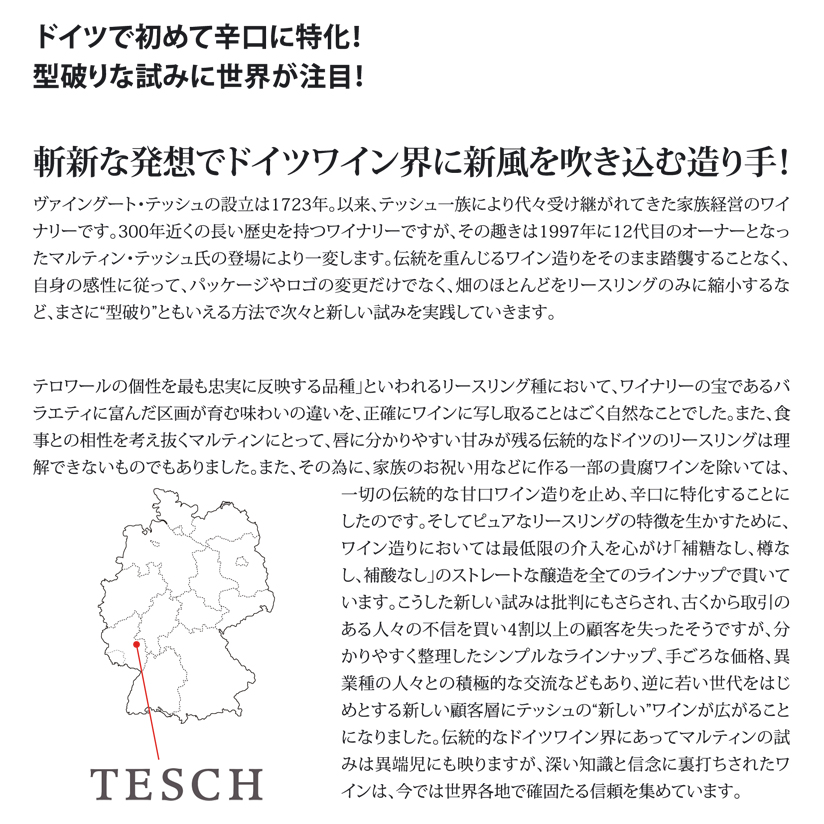 雷司令是了解大自然的一个窗口。我们的每一个葡萄园都有不同的风土。只有雷司令能完美地呈现不同风土的差异。根深深地扎入地下,老藤,采用环保方式经营管理葡萄园,人工精挑细选地采收葡萄。在酒窖里:最大限度的保持葡萄酒的天然特性,采用手工方式酿酒,选用环保可持续使用的材料来罐装酒款。用螺旋盖封瓶可以完美地保护酒款的品质,让酒液能以可靠的方式陈酿熟化,让酒款获得卓越的配餐能力。特茜(Tesch)酒庄是传统与创新兼容并蓄的酒庄,300年的历史传承,但同时也是德国最富有创新精神的酒庄之一,也许是因为我们持之以恒地将每一件事都做到点子上。我们将精力集中在最重要的事情上,从不在无用的事情上白费功夫。所以,在海内外很多顶级的餐厅或酒店的酒水单上,你会发现,我们的单一园酒款都被列在显眼的位置。