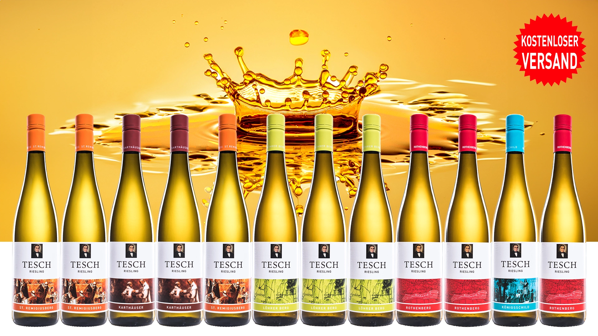 Im Paket sind 12 Flaschen (à 750 ml) Riesling trocken enthalten:
